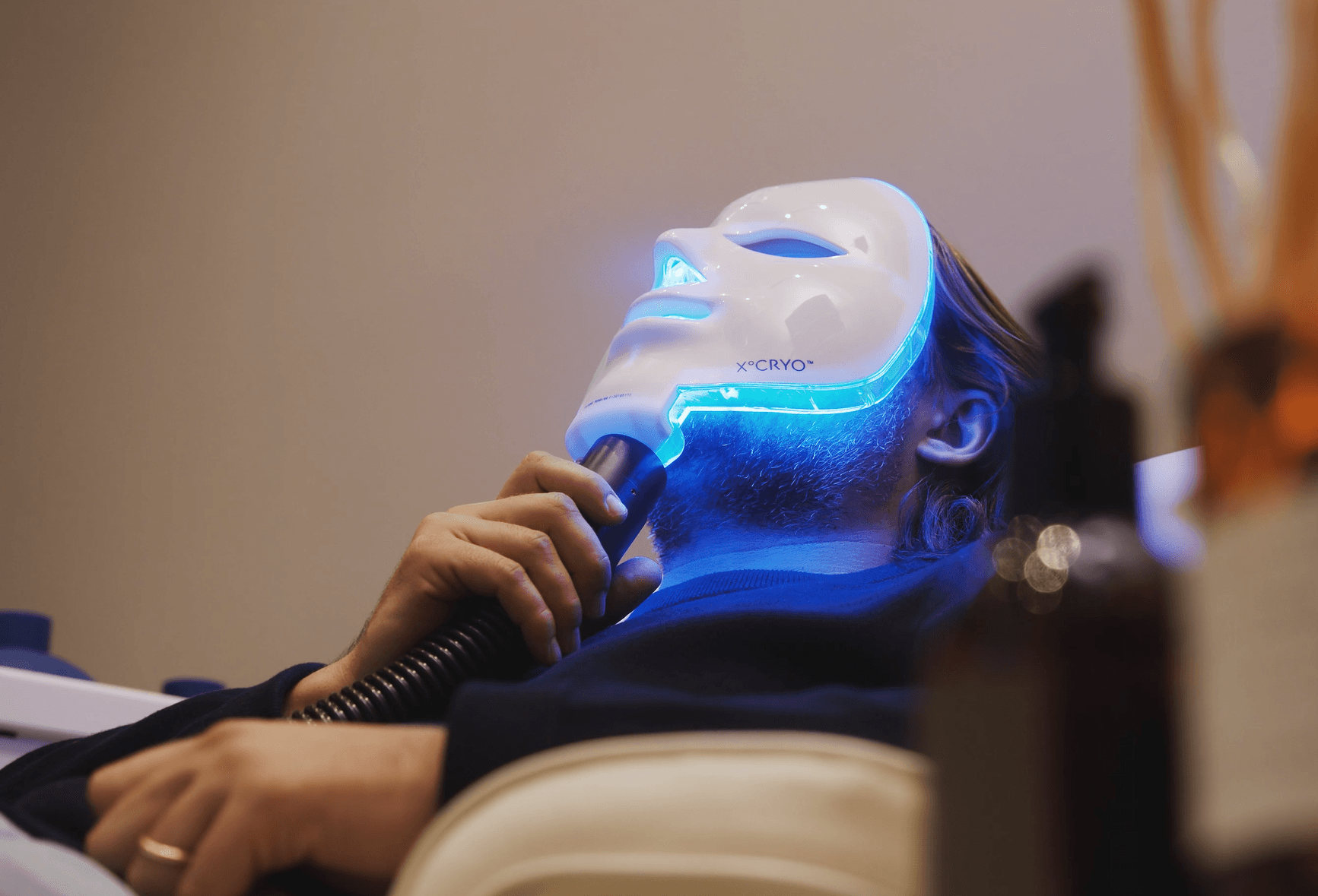En specialdesignad Kryo mask applikator med LED ljusterapi. Med hjälp av extrem kyla och ett speciellt utvecklat blått LED ljus så kan Kryo masken behandla ett stort antal olika åkommor. Masken kan anpassas till just dina behov.